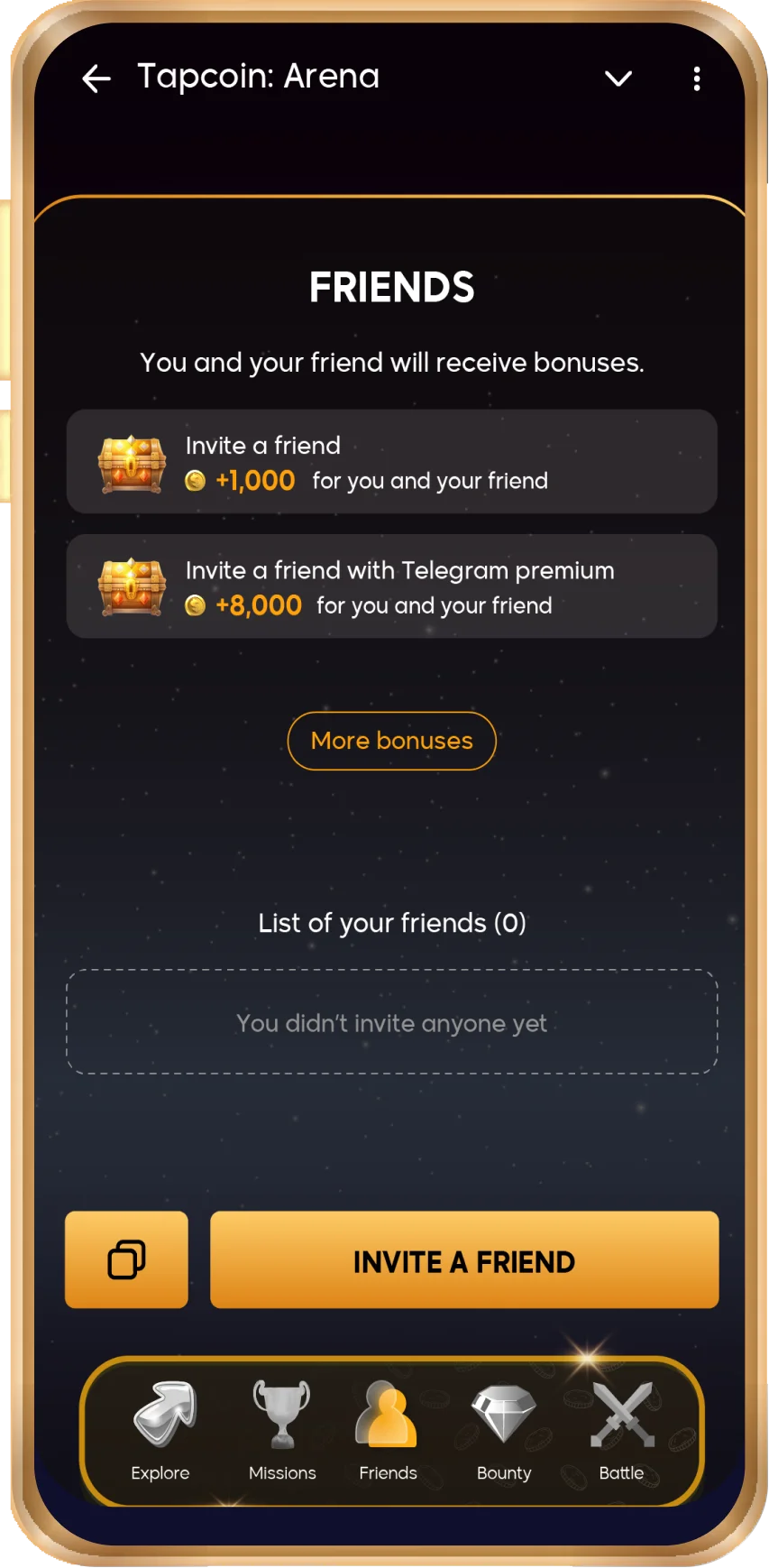 Invite your friends to join Tapcoin and both of you will receive bonuses! Earn up to 8,000 coins when you invite friends with Telegram Premium.